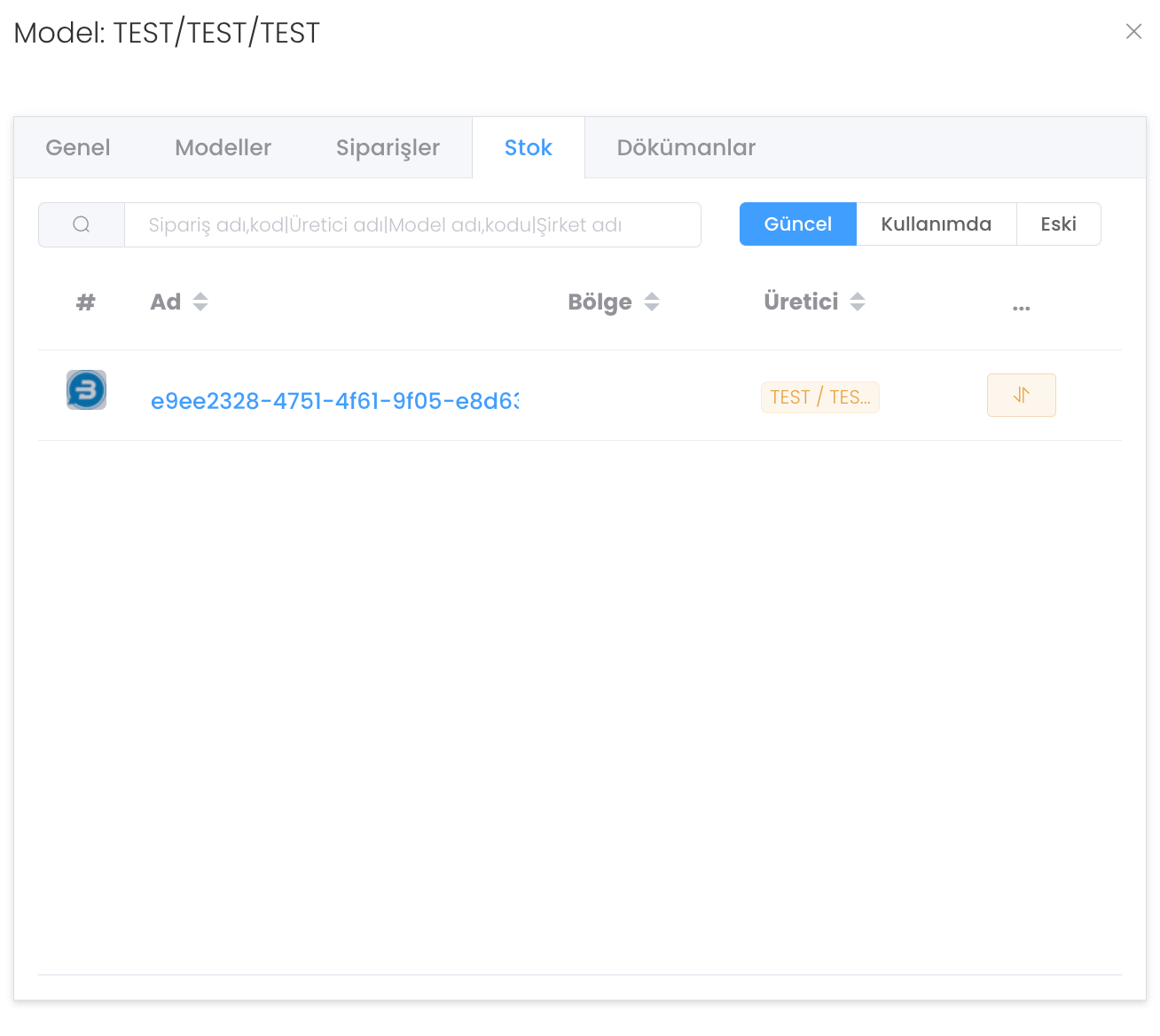 Modelinizin stok durumu Güncel-Kullanımda-Eski olmak üzere üç kategoride görüntüleyebildiği bir panel bulunmakta.