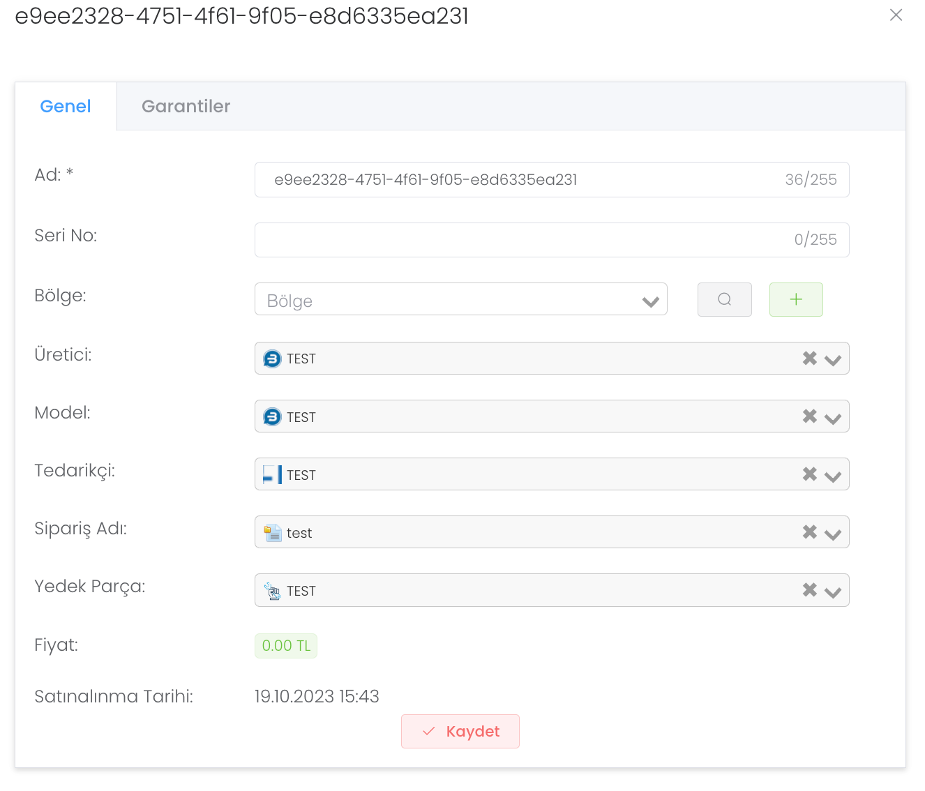 Yeni bir yedek parça tanımladığınızda otomatik olarak karşınıza bu panel gelecektir. "Genel" bölümünde modelinize oluşturduğunuz yedek parçanızın bilgilerini güncellemeniz için oluşturulmuş bir paneldir.