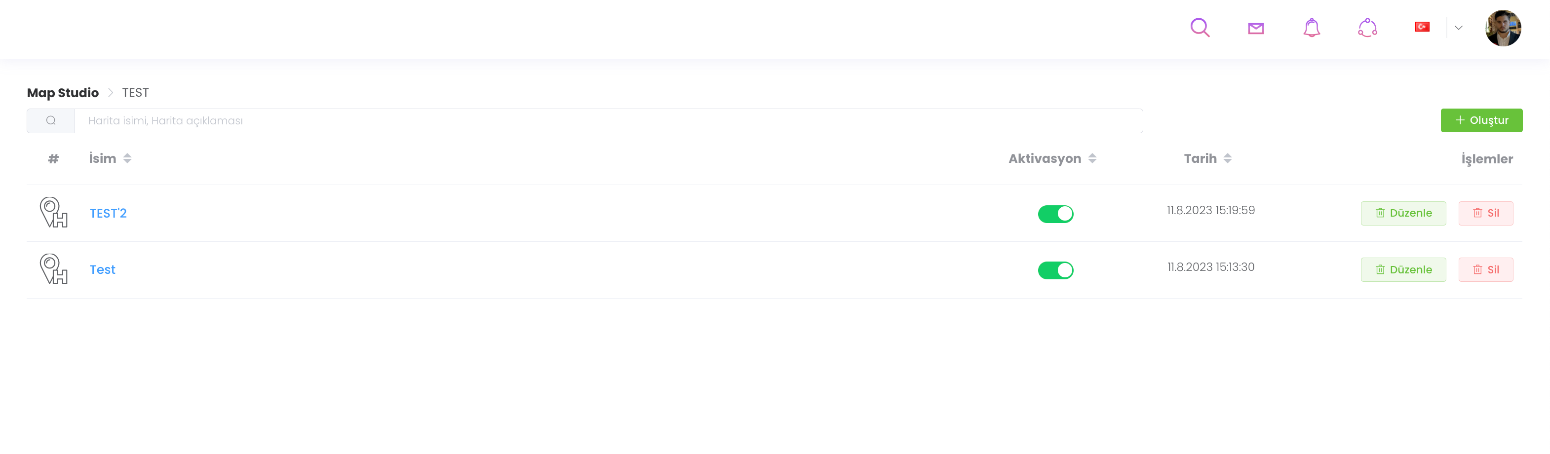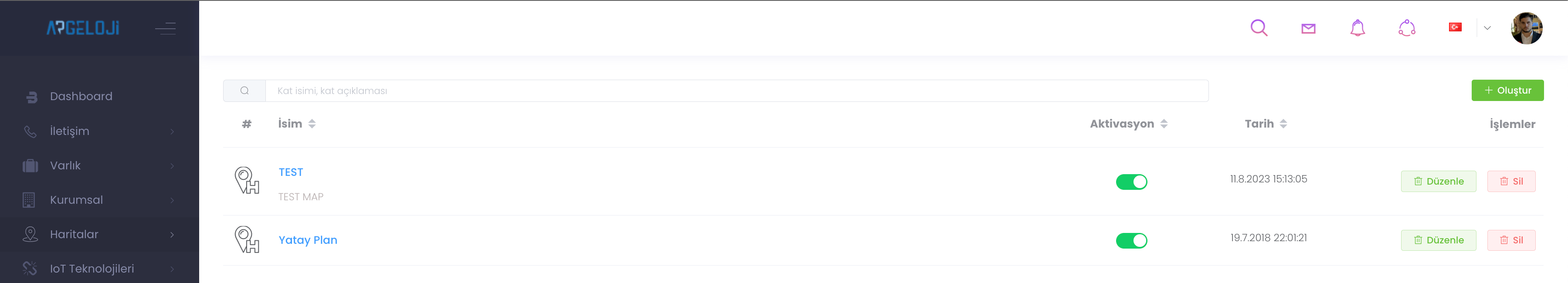 Herhangi bir haritaya girdiğinizde karşınıza oluşturduğunuz katlar çıkar. "Düzenle" butonu ile düzenleyebilir "Oluştur" butonu ile yeni kat oluşturabilirsiniz.