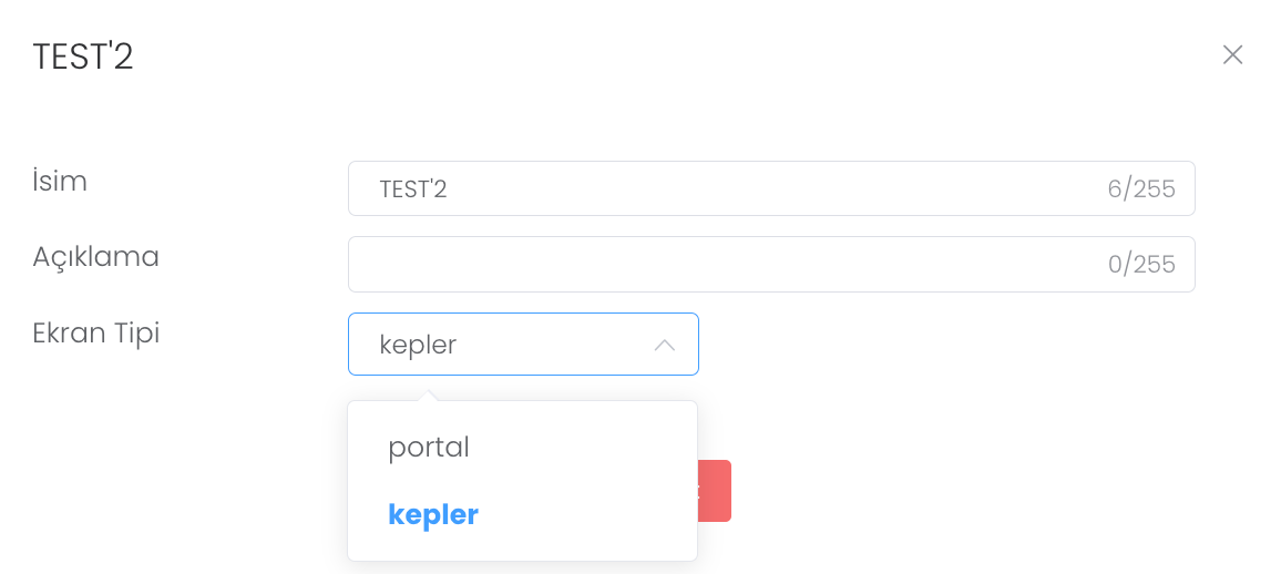 "Düzenle" butonuna tıkladığınızda karşınıza İsim, Açıklama ve Ekran Tipi gibi özellik ayarları gelir. Portal ekran tipi bilgisayardan görüntüleyebileceğiniz şekilde derler, kepler ise tabletlerde çalıştırabileceğiniz şekilde derler.