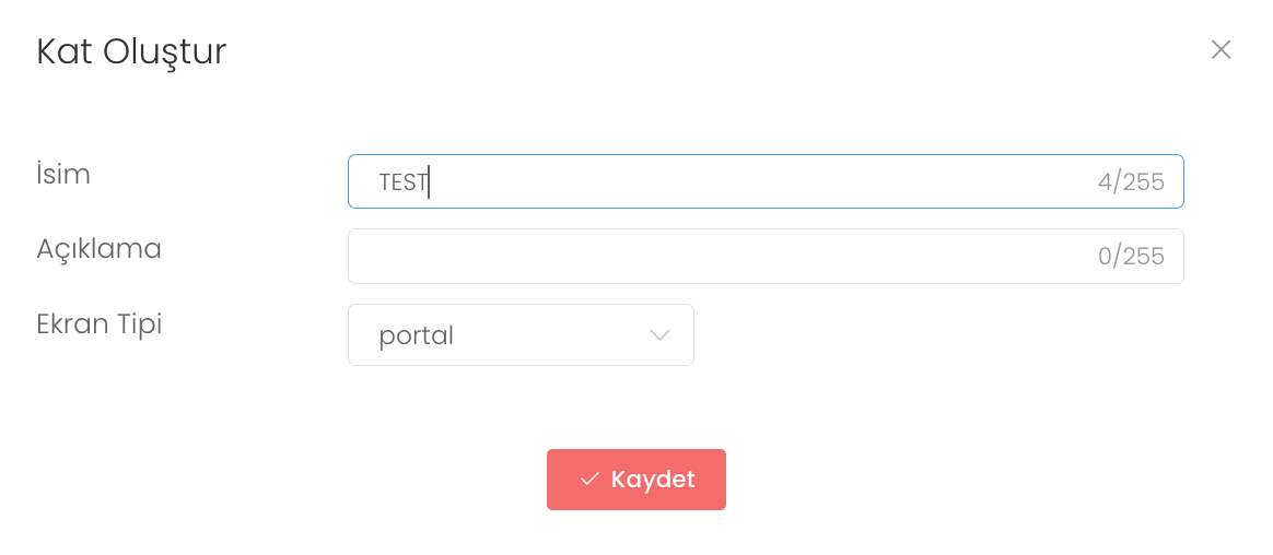 "Oluştur" butonu ile İsim, Açıklama ve Ekran Tipi gibi özellikleri ayarlayıp "Kaydet" butonuna tıklayarak kat oluşturabilirsiniz.