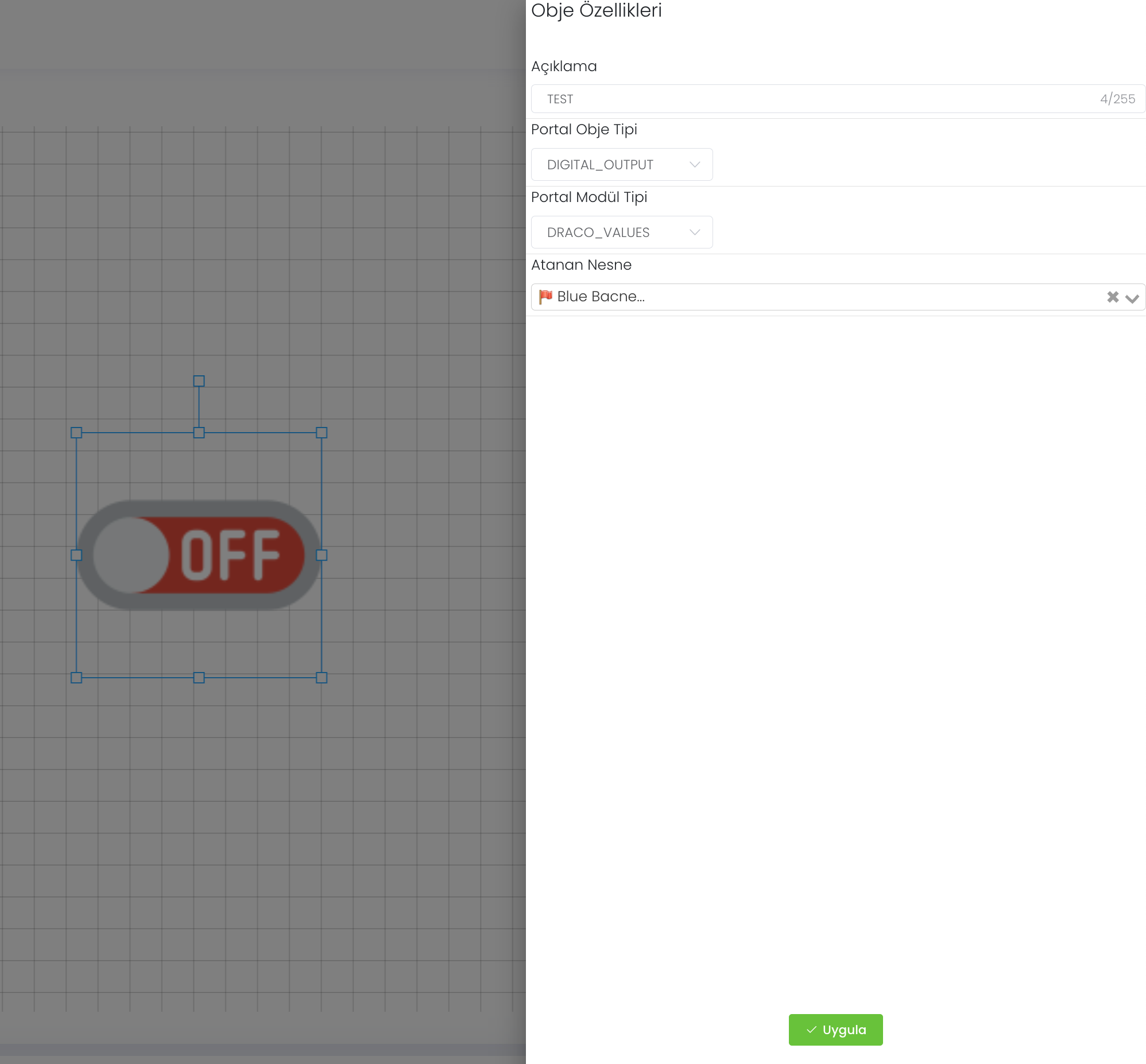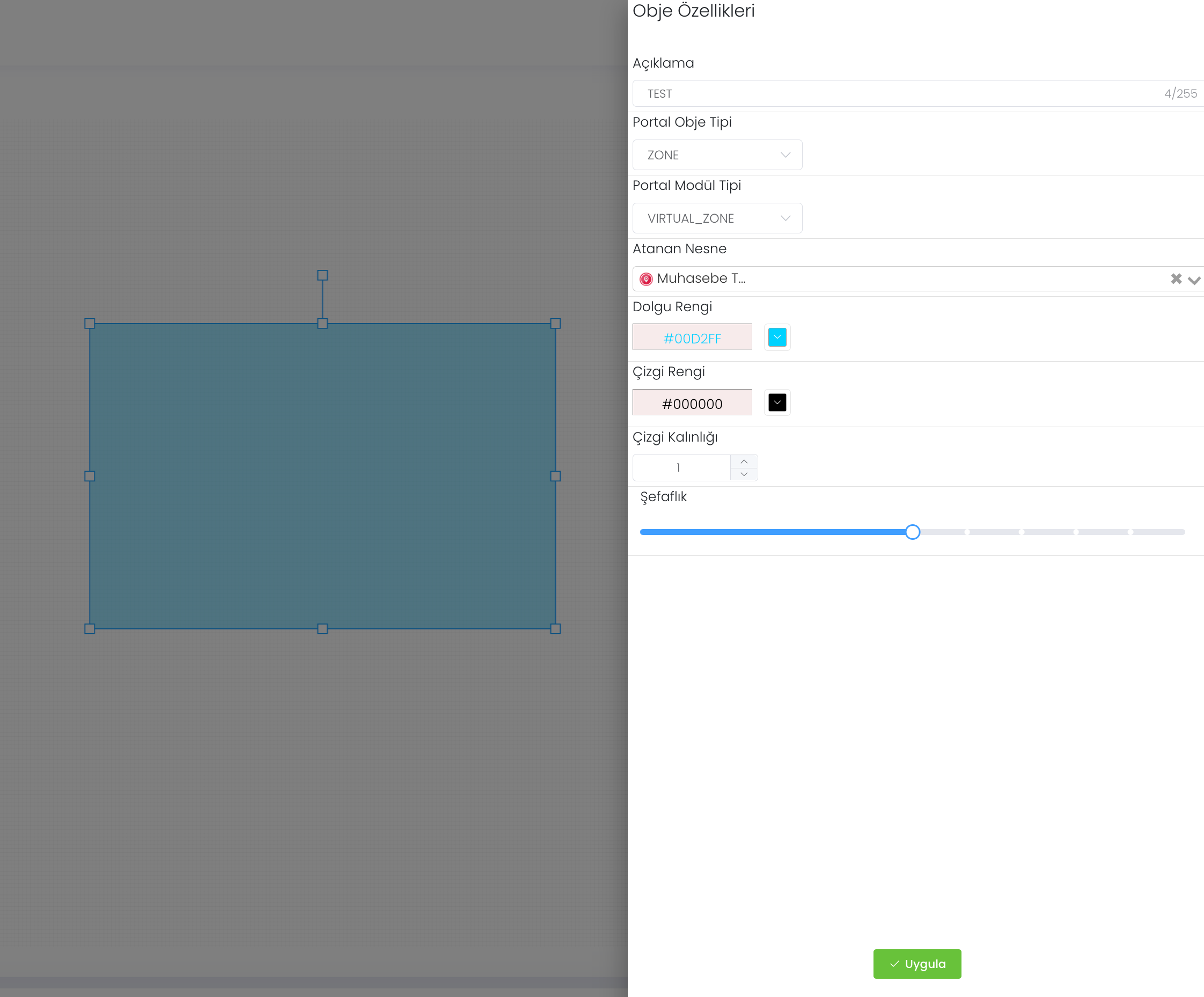 Bu dikdörtgenin üstüne tıkladığımızda bir özellik sayfası açılır. Bu bölümde Açıklama, Portal Obje Tipi , Dolgu Rengi, Çizgi Rengi, Çizgi Kalınlığı ve Şeffaflığını ayarladığımız özelleştirme alanıdır. "Uygula" butonuna tıklayarak yaptığınız değişikliği kaydedebilirsiniz.