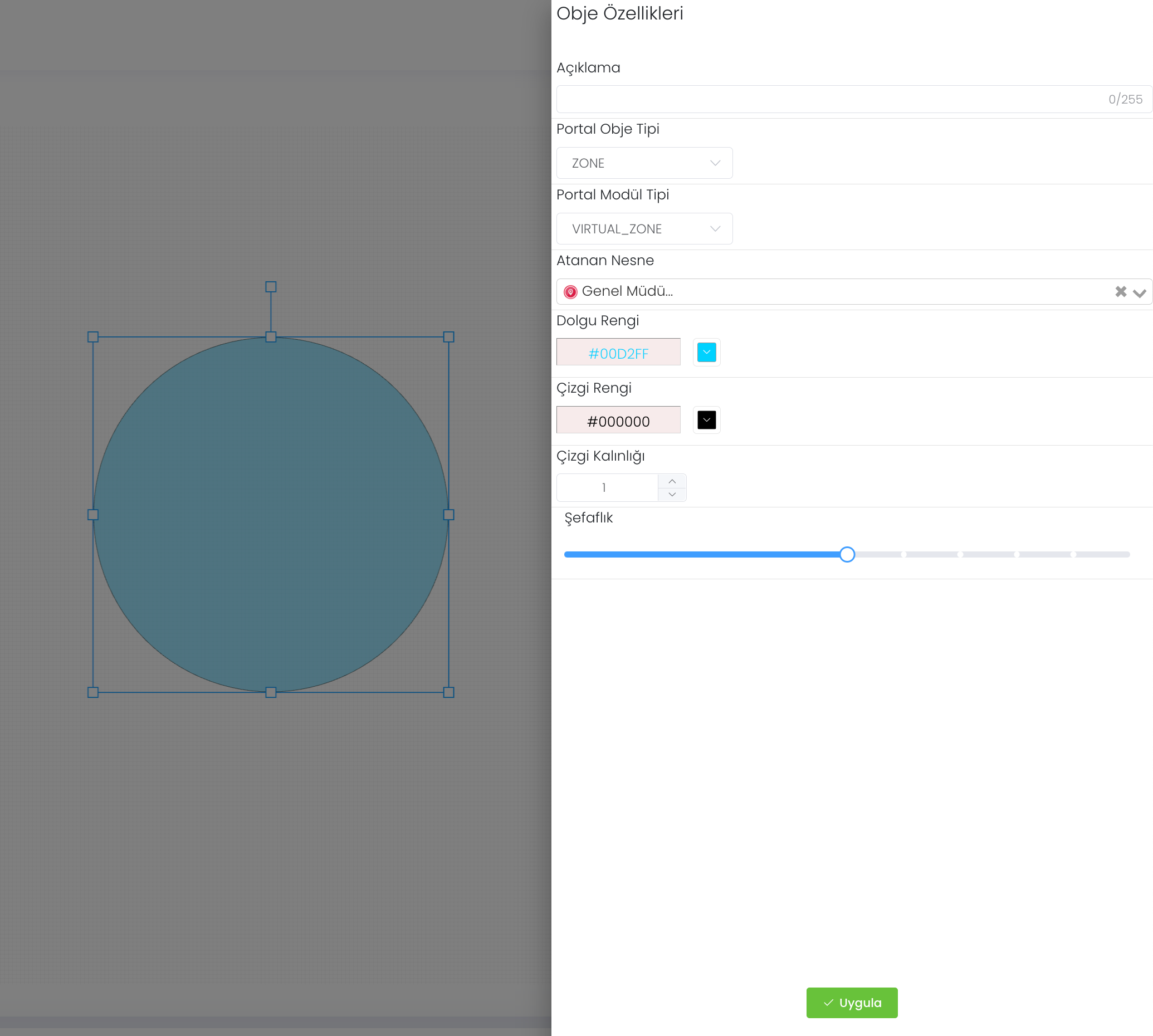 Bu çemberin üstüne tıkladığımızda bir özellik sayfası açılır. Bu bölümde Açıklama, Portal Obje Tipi , Dolgu Rengi, Çizgi Rengi, Çizgi Kalınlığı ve Şeffaflığını ayarladığımız özelleştirme alanıdır. "Uygula" butonuna tıklayarak yaptığınız değişikliği kaydedebilirsiniz.