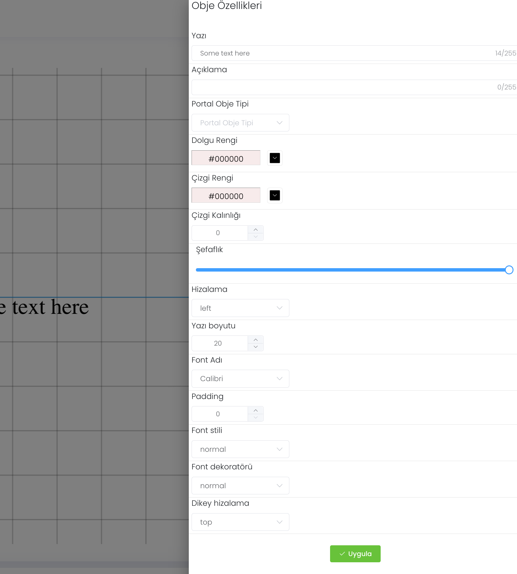 Yazının üstüne tıkladığımızda bir özellik sayfası açılır. Bu bölümde Açıklama, Portal Obje Tipi , Dolgu Dengi, Çizgi Rengi, Çizgi Kalınlığı, Şeffaflık, Hizalama, Yazı Boyutu, Font Adı, Padding, Font Stili, Font Dekoratörü ve Dikey Hizalama gibi ayarladığımız özelleştirme alanıdır. "Uygula" butonuna tıklayarak yaptığınız değişikliği kaydedebilirsiniz.