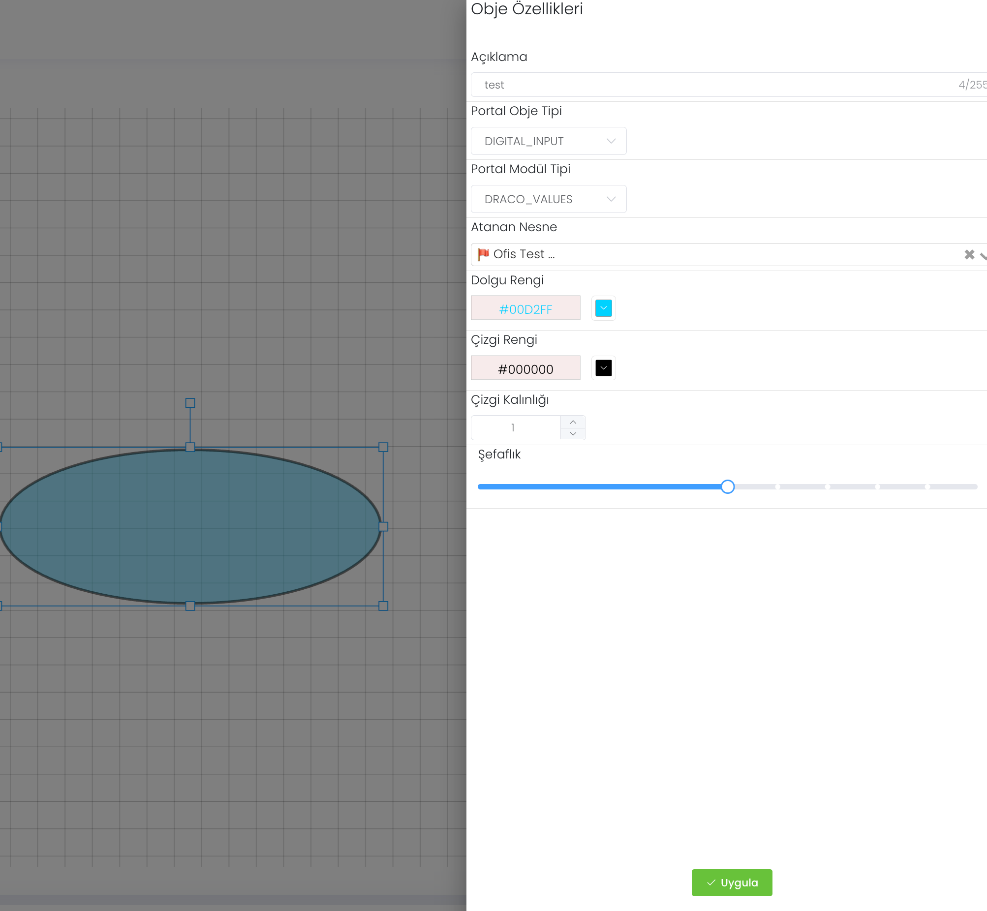 Bu elipsin üstüne tıkladığımızda bir özellik sayfası açılır. Bu bölümde Açıklama, Portal Obje Tipi , Dolgu Rengi, Çizgi Rengi, Çizgi Kalınlığı ve şeffaflığını ayarladığımız özelleştirme alanıdır. "Uygula" butonuna tıklayarak yaptığınız değişikliği kaydedebilirsiniz.