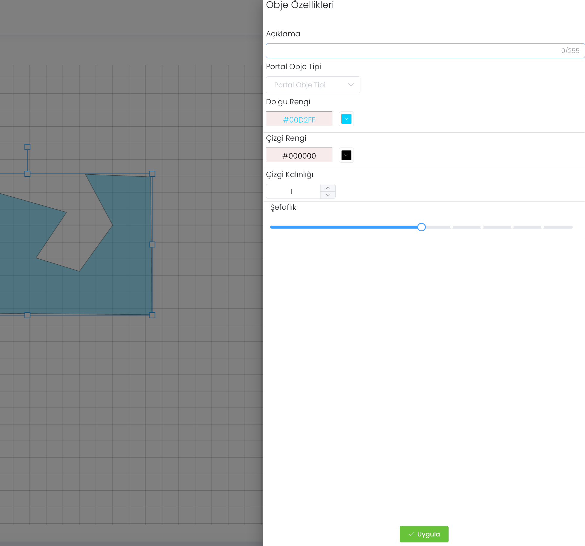 Bu çokgen üstüne tıkladığımızda bir özellik sayfası açılır. Bu bölümde Açıklama, Portal Obje Tipi , Dolgu Rengi, Çizgi Rengi, Çizgi Kalınlığı ve Şeffaflığını ayarladığımız özelleştirme alanıdır. "Uygula" butonuna tıklayarak yaptığınız değişikliği kaydedebilirsiniz.