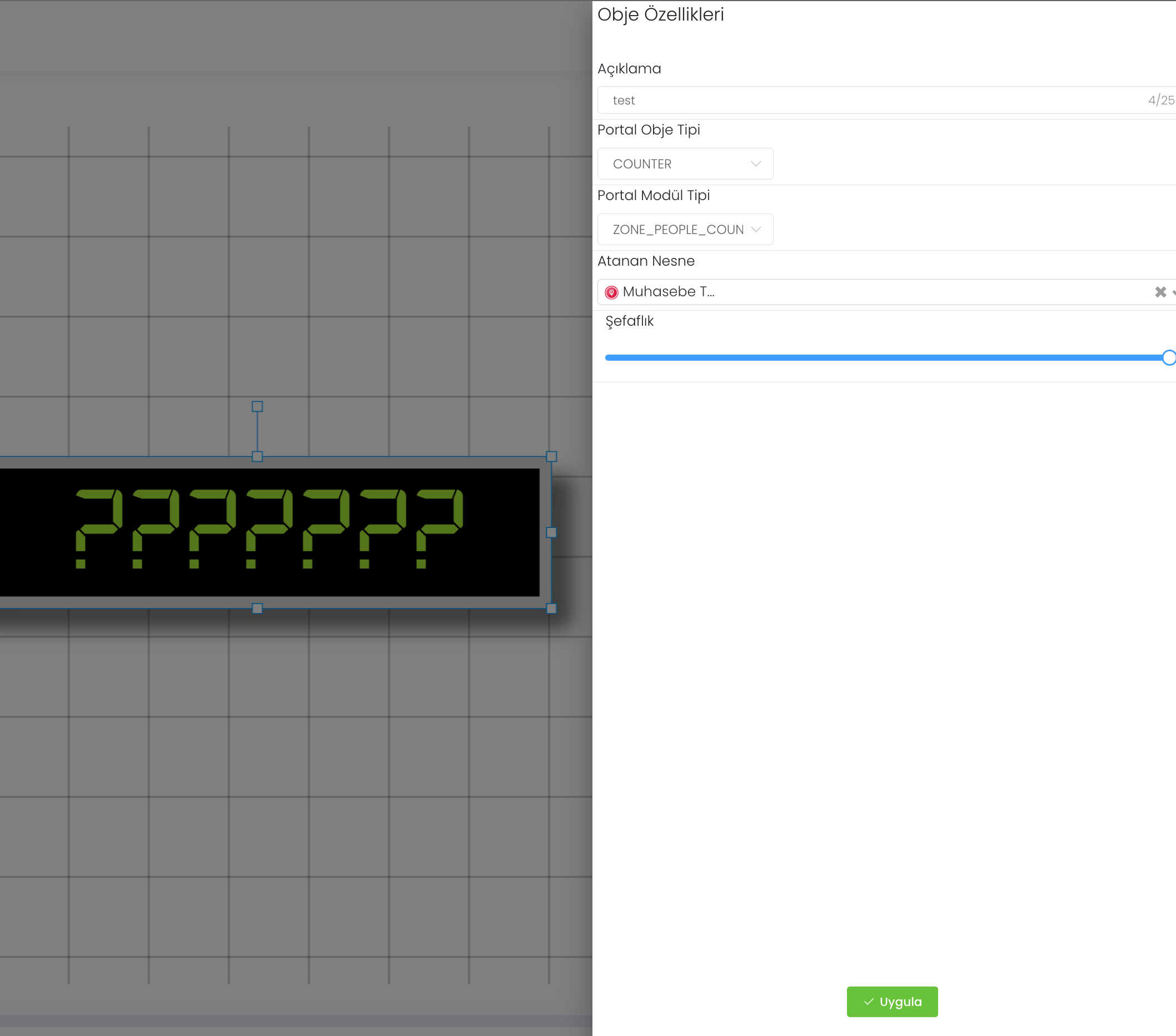 Bu sayaç üstüne tıkladığımızda bir özellik sayfası açılır. Bu bölümde Açıklama, Portal Obje Tipi , Portal Modül Tipi, Atanan Nesne ve şeffaflığını ayarladığımız özelleştirme alanıdır. "Uygula" butonuna tıklayarak yaptığınız değişikliği kaydedebilirsiniz.