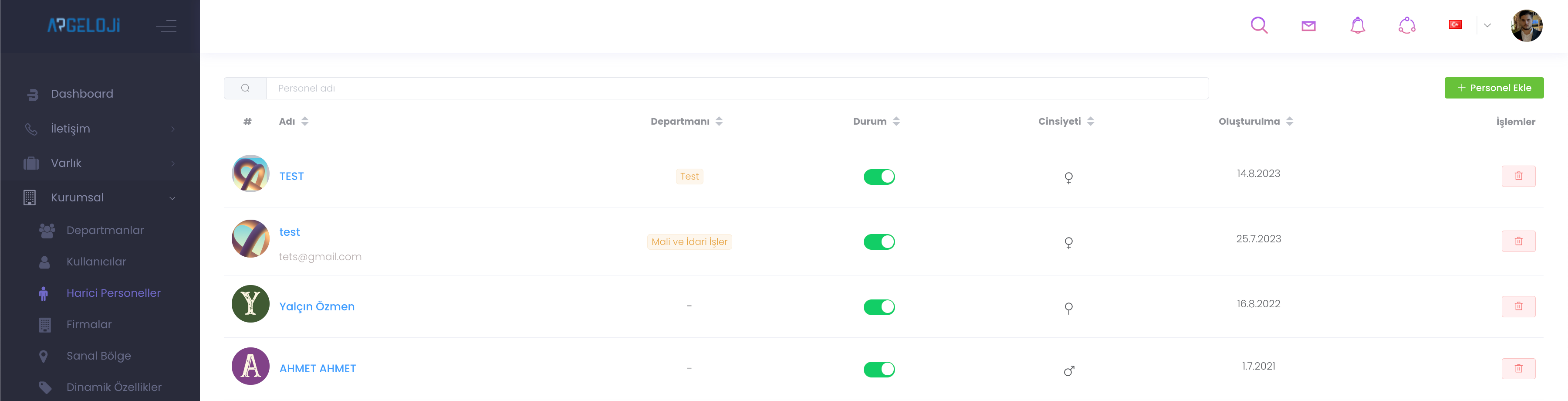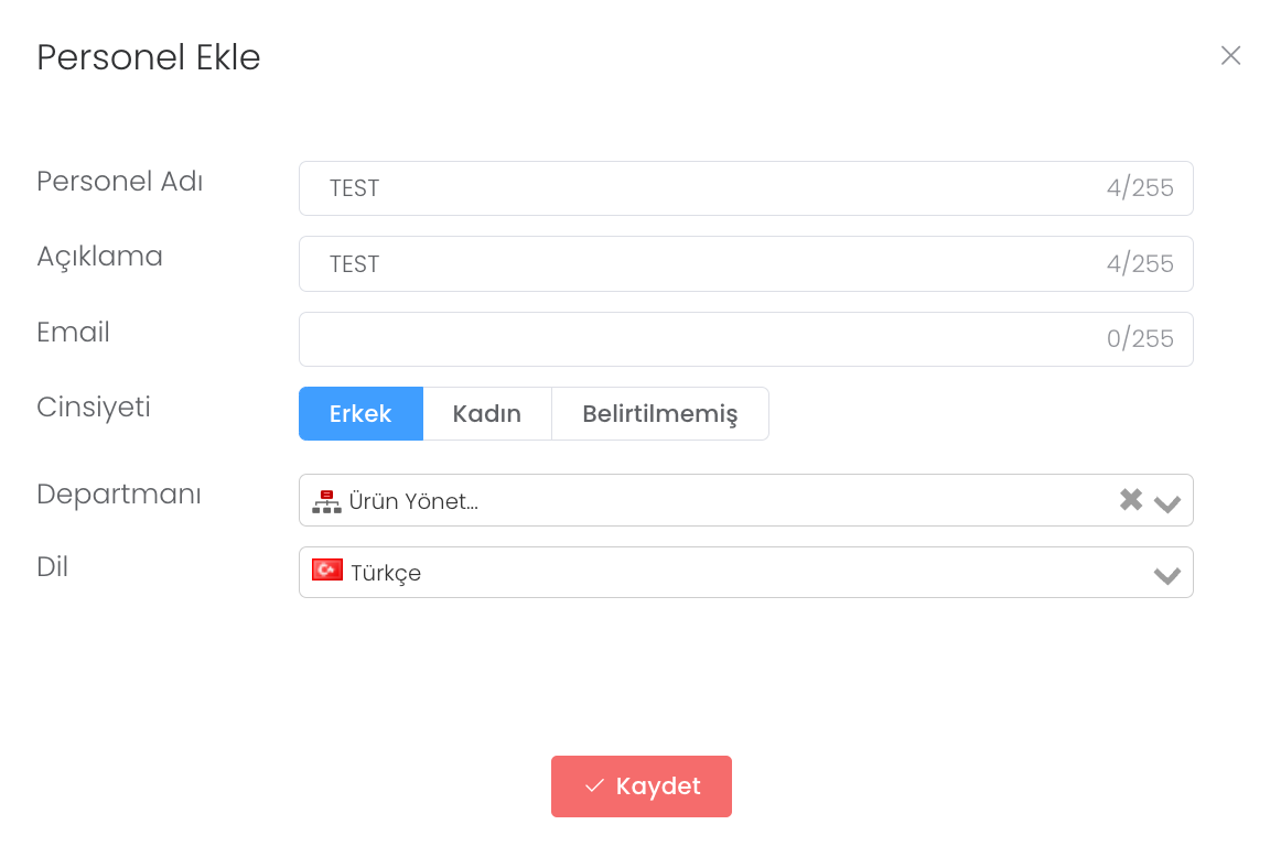 “Personel Ekle” bölümünden personel adı, mail, cinsiyet, departmanı gibi özellikleri tanımlayıp kaydet dedikten sonra yeni personelinizi eklemiş olursunuz.