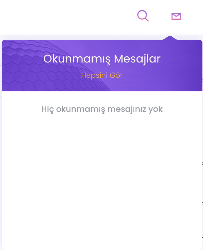 Portal Kullanıcı ArayüzleriMesajlar Üst BarMesajlar Üst BarMesajlar ikonuna bastığınızda size gelen mesaj bildirimlerini okuduğunuz ve üstüne tıkladığınızda o mesaja gittiğiniz kısaltma yapıdır. Hepsini Gör yazısına tıklayarak tüm mesajların olduğu bölüme gidebilirsiniz.