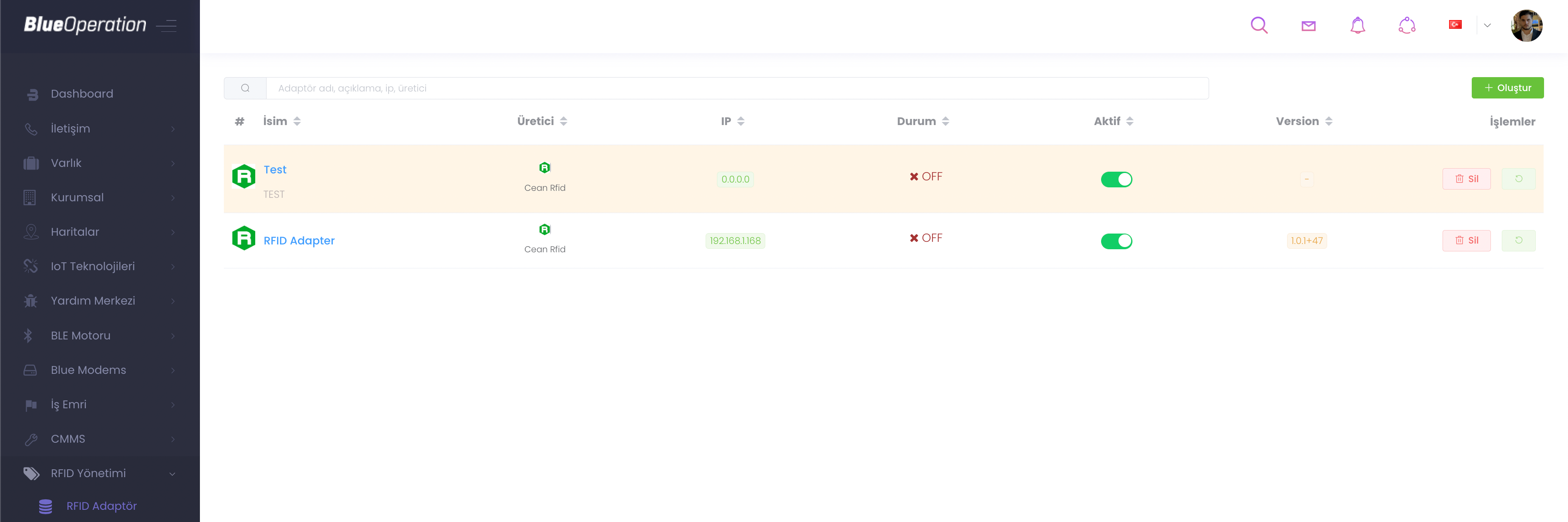 RFID Yönetim paneli tüm RFID okuyucu, etiket, bölge, ayarlar vb. modelleri yönettiğiniz paneldir. Mevcut bir RFID tanımlamadıysanız "Oluştur" butonuna basarak yeni bir RFID Adaptörü oluşturabilirsiniz.