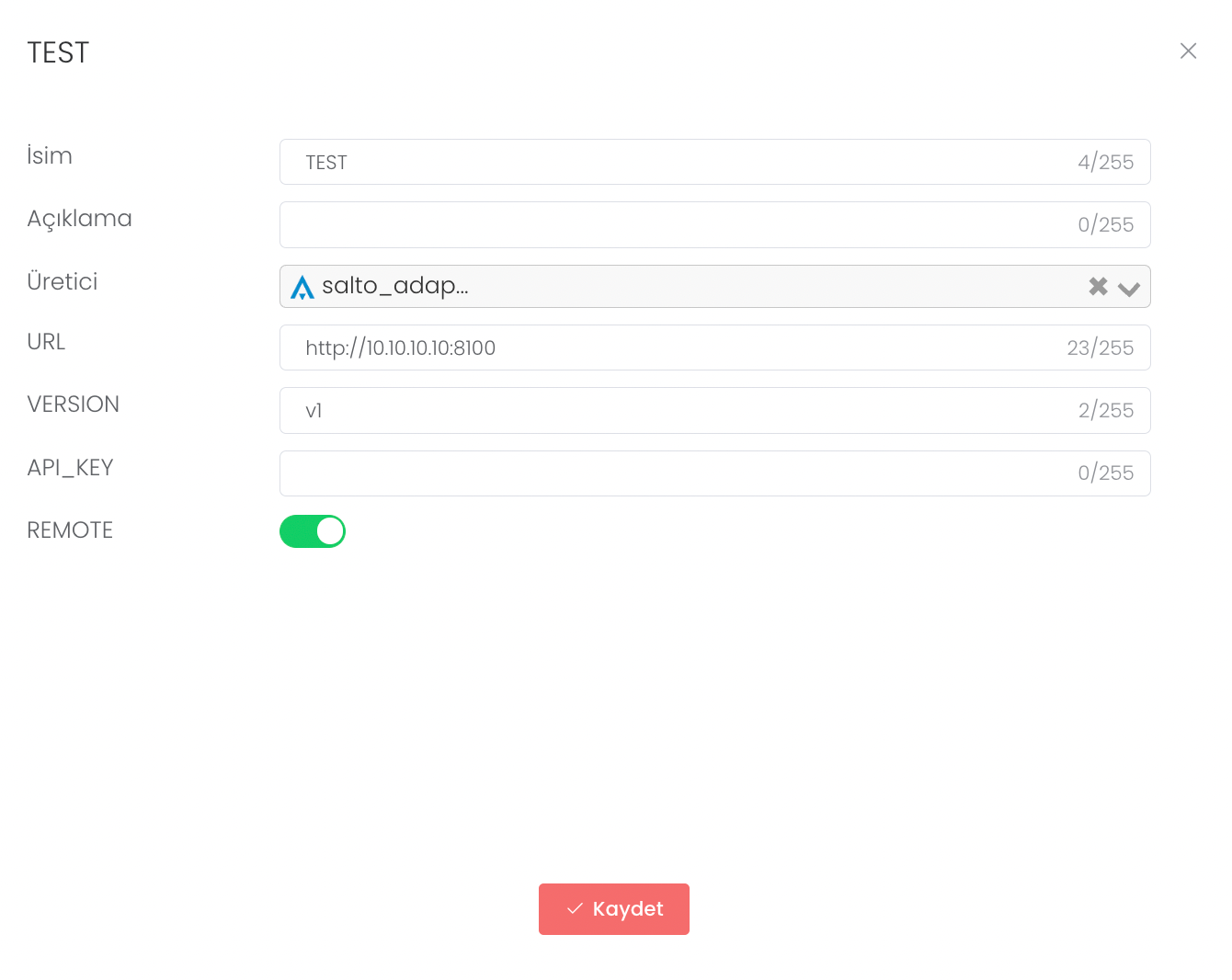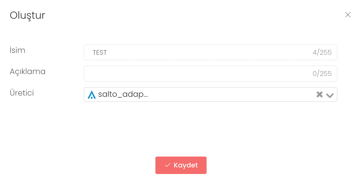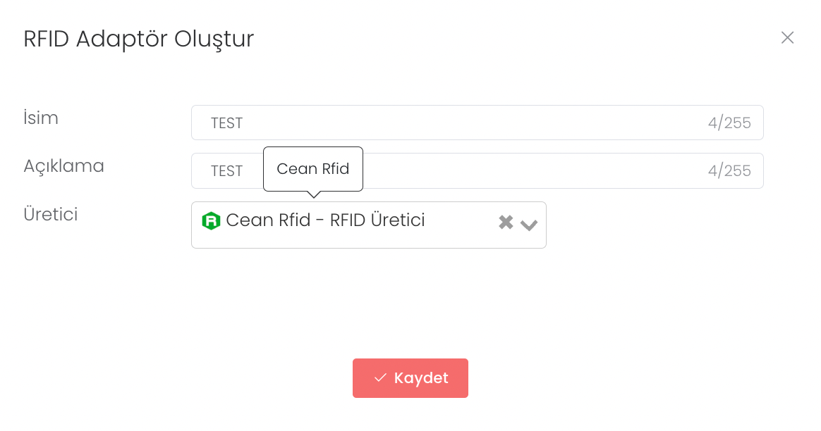 "Oluştur" butonuna bastıktan sonra karşınıza gelen alanda isim, açıklama ve üretici bilgisini girip, "Kaydet" butonuna tıkladıktan hemen sonra yeni bir RFID adaptörü oluşturursunuz.