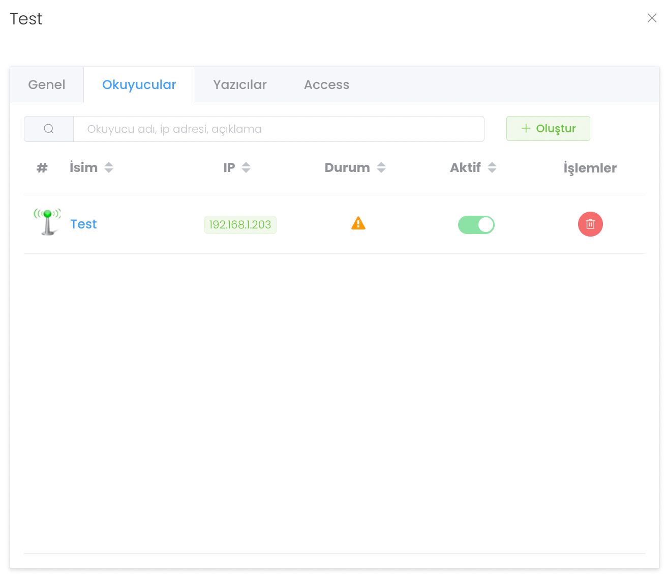 Yeni bir okuyucu eklemek isterseniz "Oluştur" butonuna tıklayarak RFID okuyucu oluşturma bölümüne gidebilirsiniz.