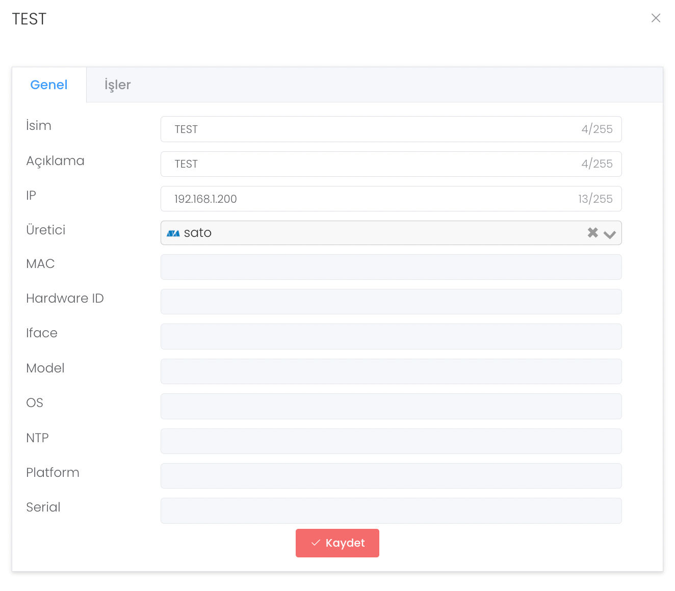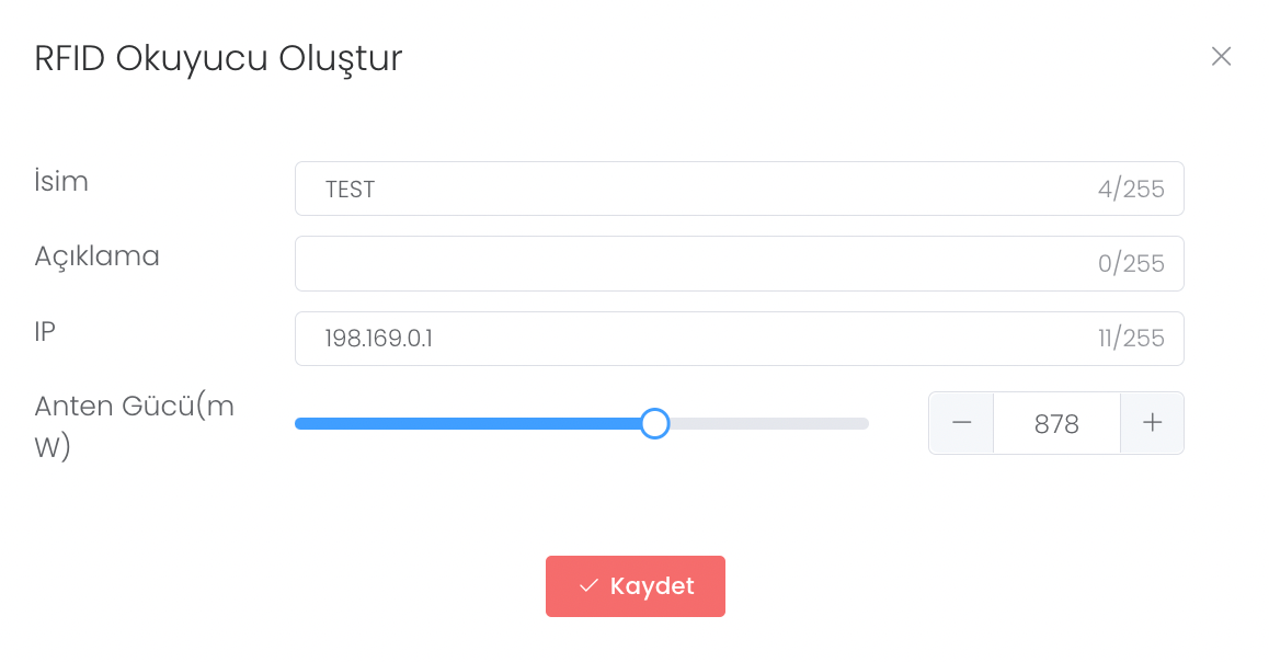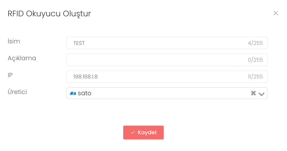 "Oluştur" butonun bastıktan sonra isim, açıklama, Ip bilgisi ve üretici bilgileri girilir. "Kaydet" butonuna tıklayarak "RFID Okuyucu Oluşturma" işlemini başarıyla gerçekleştirirsiniz.