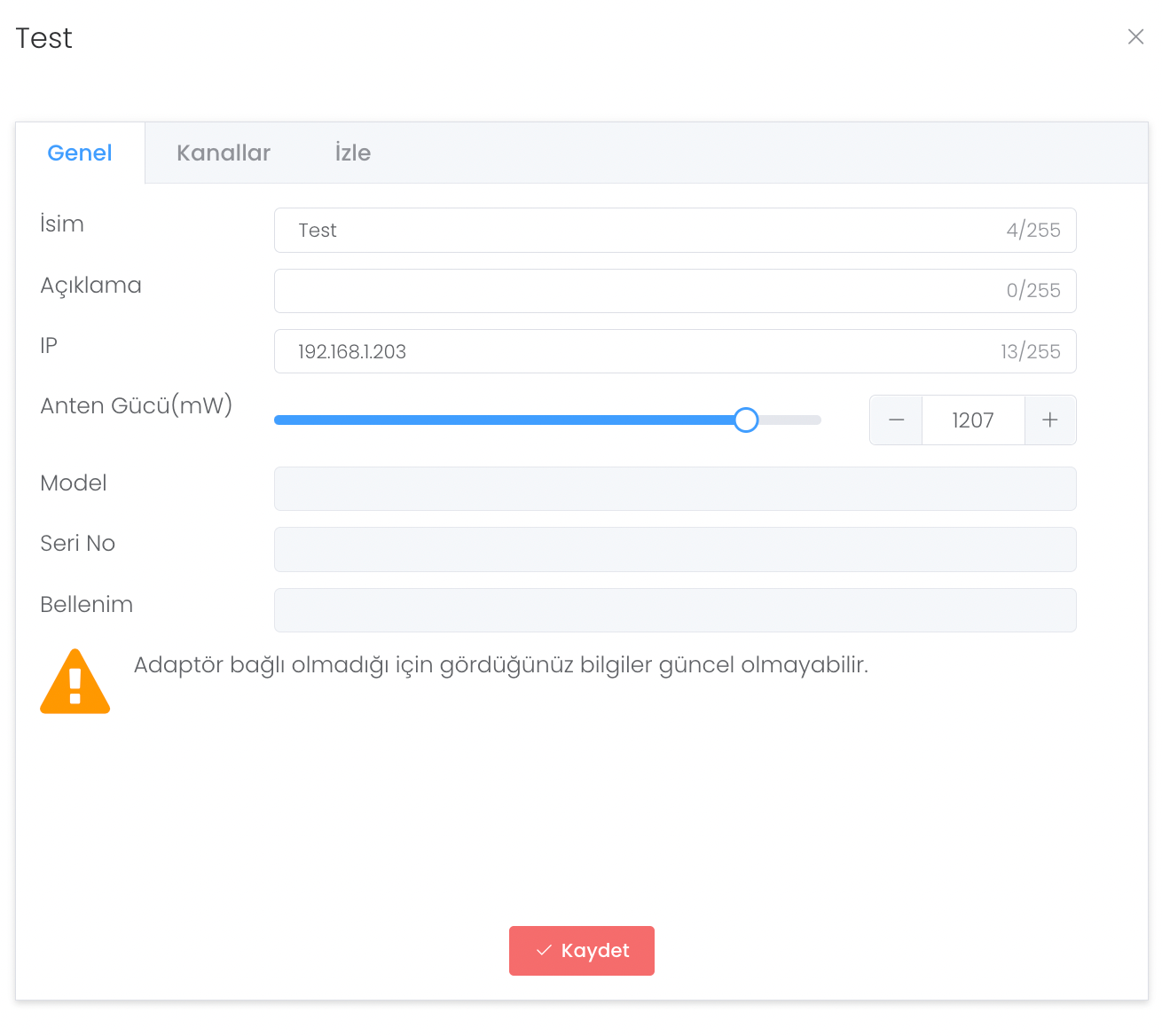 Oluşturduğunuz okuyucunun üstüne tıkladığınızda size 3 farklı alan açılır. Genel bölümünde okuyucu oluştururken girdiğiniz bilgileri düzenleyebilir adaptörün durumunu görebilirsiniz.