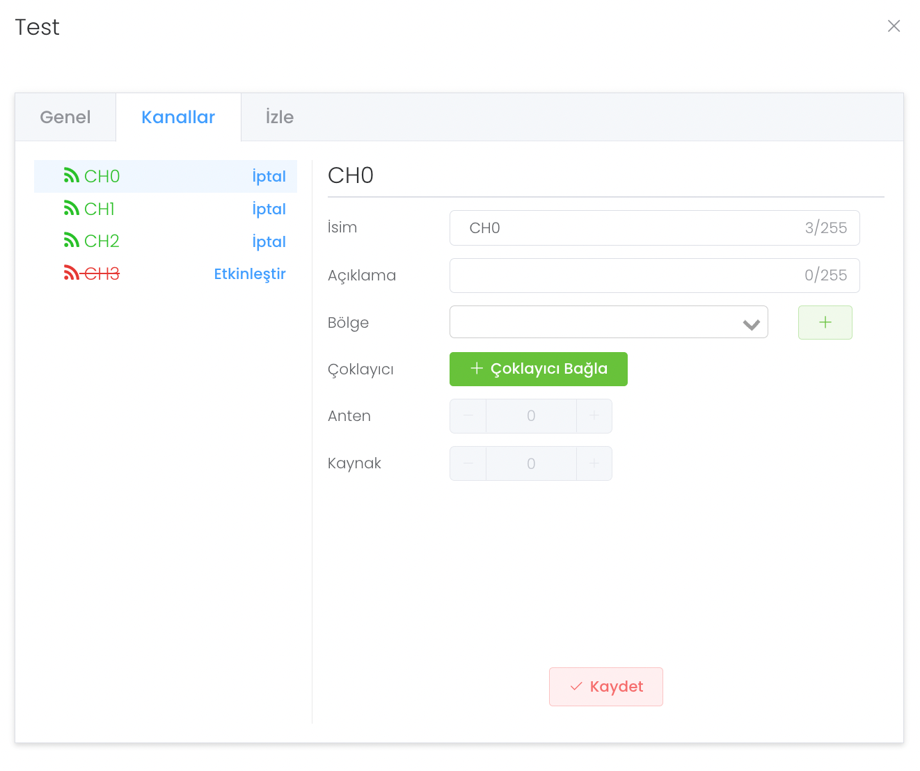 Kanallar bölümünde bağladığınız okuyucu üzerindeki kanaları görebilir, kanala bölge belirleyebilir, "Çoklayıcı Bağla" butonu ile de bir çoklayıcının altında farklı çoklayıcılar açabilirsiniz. İptal butonu ile kanalı deaktif ederken etkinleştir ile kanalı tekrar aktif edebilirsiniz.
