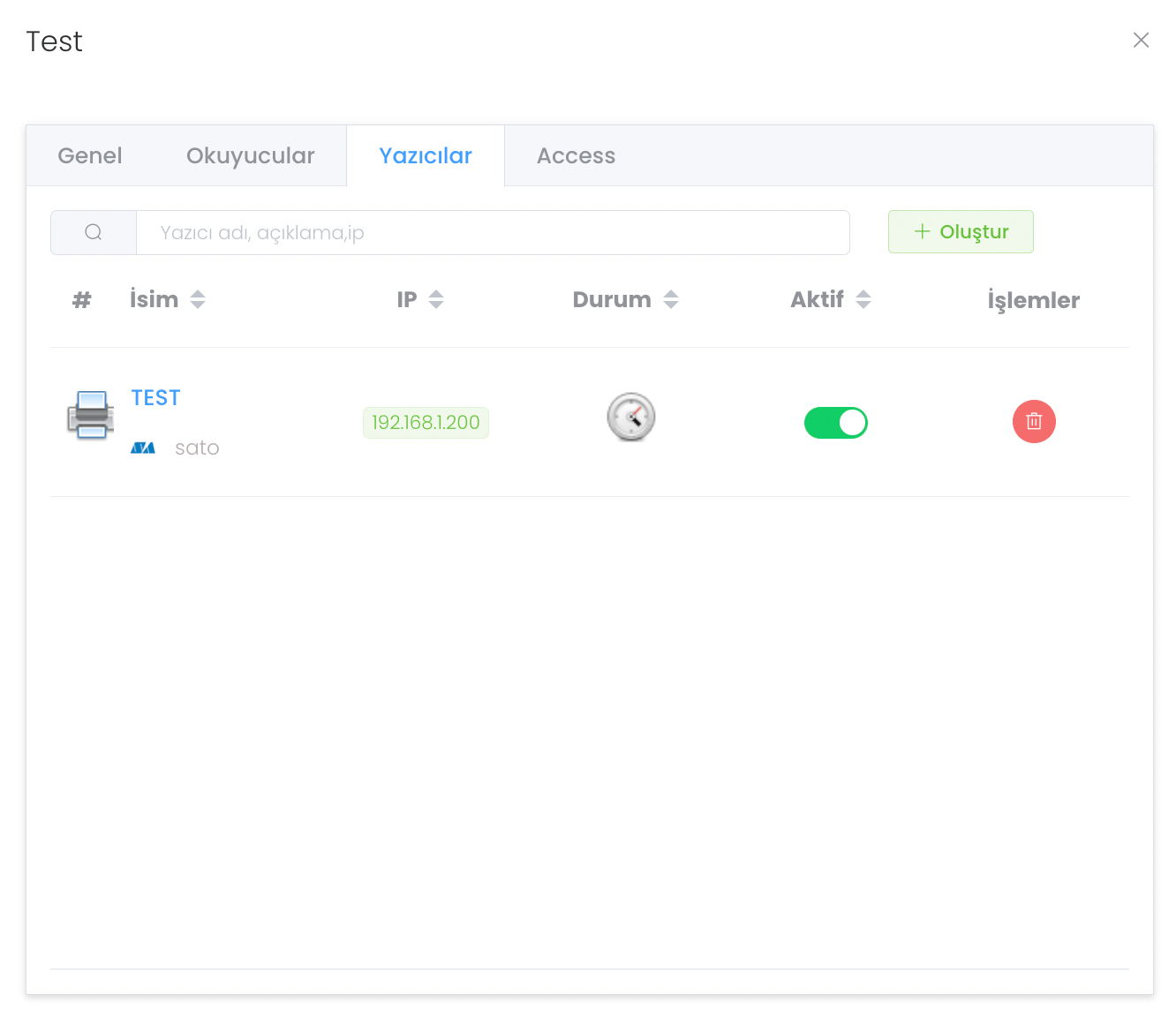 Yazıcılar bölümü oluşturduğunuz adaptörün okuyucu kısmı ile etkileşimde olacak yazıcılar modülüdür. Eğer tanımlanmış bir yazıcınız yoksa "Oluştur" butonuna tıklayarak yeni bir yazıcı oluşturabilirsiniz.