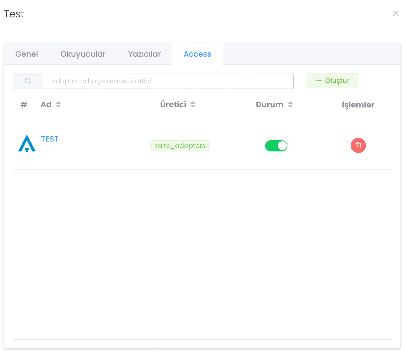 Access bölümü adaptörün erişimi hakkında yönetiminin yapıldığı alandır. "Oluştur" butonu ile yeni bir access tanımlayabilirsiniz.