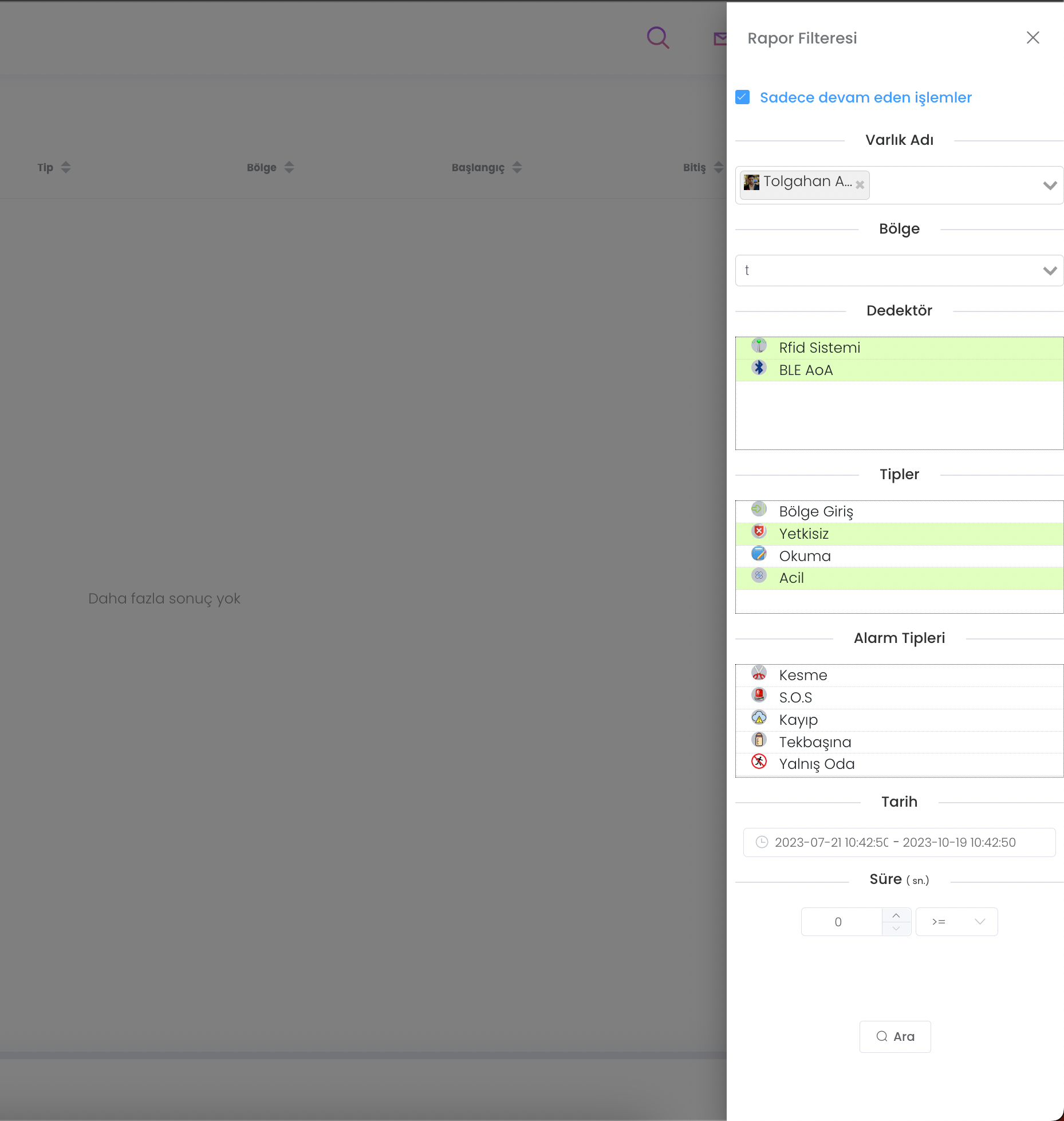 Filtreleme butonuna bastığınızda tüm bilgileri eksiksiz doldurup raporlamak istediğimiz süre zarfını tarih bölümünden belirttikten sonra "Ara" butonuna tıklayınız.
